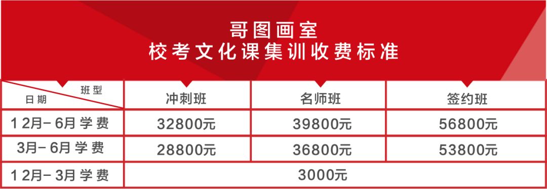 哥图画室注重专业、文化两手抓,最后有一个完美的结果,文化课12月期间每周规划20课时学习时间,为学员的文化打下牢固的基础。